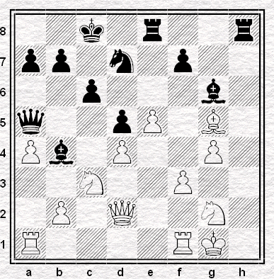 12.Cg2 Bg6 13.f3 h5 14.e4 hxg4 15.hxg4 Da5 16.De2 0–0–0 17.e5 Cd5 18.Bxd5 exd5 19.Bxg5 Tde8 20.Dd2